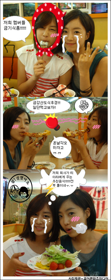 은정과 지연은 각자 스케줄을 소화하다가 시간이 맞아 단 둘이 오붓한 시간을 가졌다. 공개된 사진에서 두 사람은 캐주얼한 옷차림에 옅은 화장을 한 채로 피자와 아이스크림을 다정히 먹는 모습을 연출했다. ‘저희 회사가 티아라에게 주는 추천음식. 전부 풀이네 T.T’ ‘금강산도 식후경 일단 먹고 보자. 혼날 각오 하자고’ ‘금기식품!!!’이라는 글을 사진에 넣기도 했다.