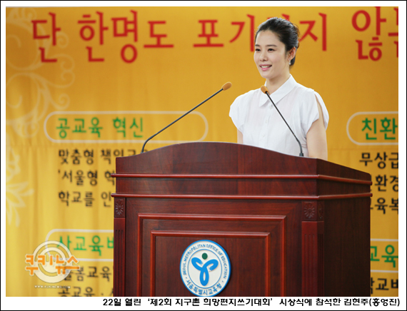 ‘굿네이버스’ 홍보대사로 활동 중인 김현주는 22일 서울 신문로 교육청에서 열린 ‘제2회 지구촌 희망편기쓰기대회’ 시상식에 참석해 부친상 이후 공식 나들이를 했다. 흰색 블라우스를 입고 환하게 웃는 얼굴로 단상에 오른 김현주는 격려사로 수상자를 축하했다.
