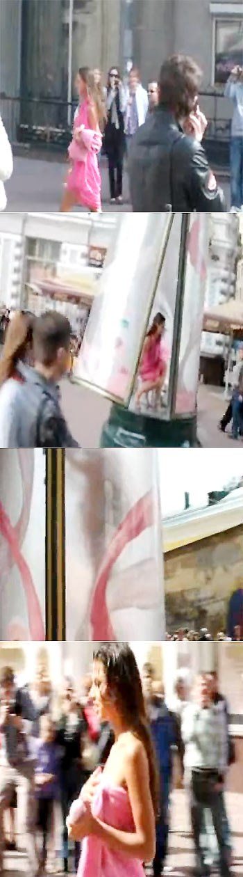 도심 한 복판에 거칠 것 없는 행동은 광고의 일환으로 보인다. 도심에 세워진 기둥에 목욕제 사진이 걸려있고 샤워를 마친 여성이 같은 제품을 들고 나온다. 또 촬영된 화면 구도가 상당히 안정적인 것도 연출된 장면임을 짐작하게 하는 대목이다.