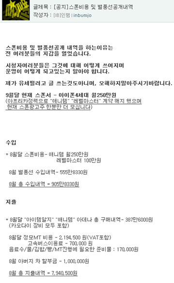 나우콤에서 제공하는 아프리카TV에서 게임 관련 방송을 진행하는 BJ(방송자키) ‘인범’은 4일 자신의 팬클럽 홈페이지에 공지사항을 통해 8월수입 내역을 공개했다.