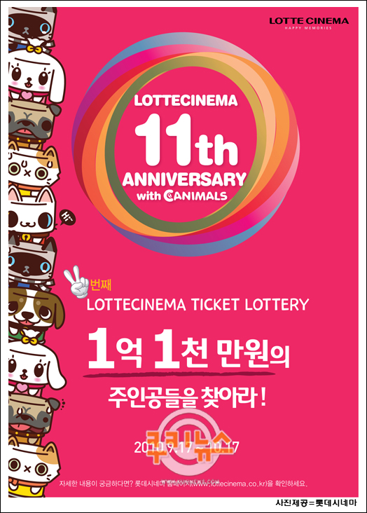 첫 번째 이벤트로는 롯데시네마 11주년 기념 및 추석맞이 경품 이벤트인 ‘롯데시네마가 총 1억1000만원을 쏩니다! 100만원 행운의 주인공이 되세요!’라는 행사가 진행된다. 오는 17일부터 한달 간 진행되는 이 이벤트는 쿠폰 번호를 눌러 쇼케이스 잠금장치를 열거나 스크래치 복권에 당첨되는 고객에게 현금 100만원을 증정하는 이벤트이다. 롯데시네마에서 영화 티켓을 구매한 고객은 누구나 참여 가능하며 서울 청량리, 건대입구, 에비뉴엘, 노원, 신림, 홍대입구 등 영화관 홀에 설치된 쇼케이스 행사장에 참석하면 된다. 현금 증정 외에도 무료 영화 관람권, 인형 증정 등 별도의 상품도 준비됐다.