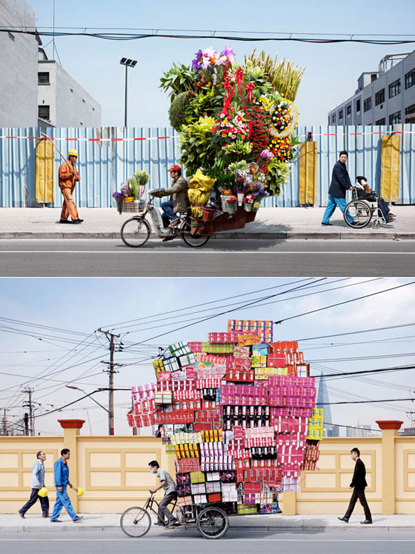 알랑 델롬은 지난해부터 올해까지 상하이에서 머물며 중국인이 자전거나 오토바이, 수레에 물건을 쌓아올려 옮기는 장면을 렌즈에 담았다.