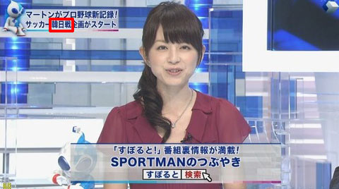 8일 일본 각종 블로그에 따르면 최근 후지TV의 한 스포츠 뉴스 프로그램은 12일 서울에서 열리는 양국 축구대표팀 경기를 두고 ‘한일전’라는 표현을 사용했다. 아나운서 세 명이 스튜디오에 등장하는 장면에서 화면 왼쪽 상단에 ‘한일전’이란 자막(사진 붉은 네모 안)은 오랫동안 비춰졌다.