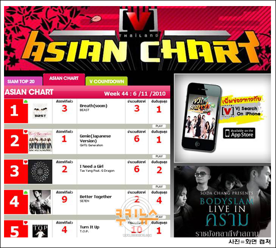 12일 태국을 처음 방문한 비스트는 발매하자마자 ‘차트 1위’를 차지하는 등 현지에서 뜨거운 반응을 얻고 있다. 오는 13일에는 태국 방콕에서 열리는 ‘2010 엠넷 얼티미트 라이브 콘서트’(M.net Ultimate Live in Thailand) 무대에 올라 현지 팬과 만난다. 14일 귀국할 예정이다.
