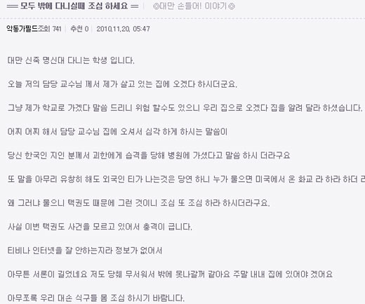 '악동가필드'란 네티즌은 20일 대만 교민과 유학생들이 많이 모이는 커뮤니티에 '모두 밖에 다니실 때 조심하세요'란 경고성 글을 올렸다.