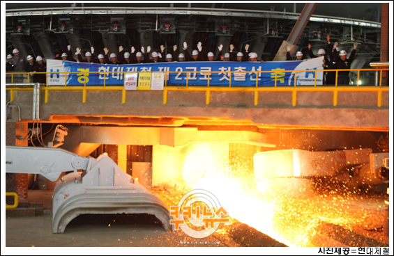 [쿠키 경제] 연산 400만톤 규모의 제2고로를 완공한 현대제철이 첫 쇳물 배출로 신고식을 마쳤다.