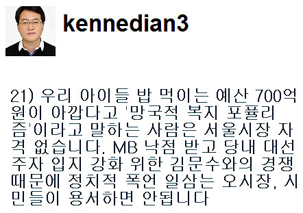 그는 "(오시장은) 쩨쩨하게 굴지 마시라. 서울시가 불요불급한 토건개발사업에 얼마나 막대한 예산을 펑펑 쓰는지 당신도 알고 나도 안다"며 "MB 눈에 들려고 우리 아이들 밥 먹이는 예산가지고 '망국적 복지 포퓰리즘' 운운하지 마시길"이라고 지적했다.