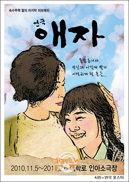 지난해 11월 5일부터 서울 대학로 인아 소극장에서 진행 중인 연극 ‘애자’는 영화에서 보여준 전개보다 한층 더 강화된 스토리 라인으로 관객에게 감동을 선사하고 있다. ‘엄마와 딸’이라는 다소 평범해 보일 수 있는 이야기이지만, 전 세대의 공감을 이끌어내기에 충분하다는 평가를 받아 다음 달 27일까지 연장 공연한다.