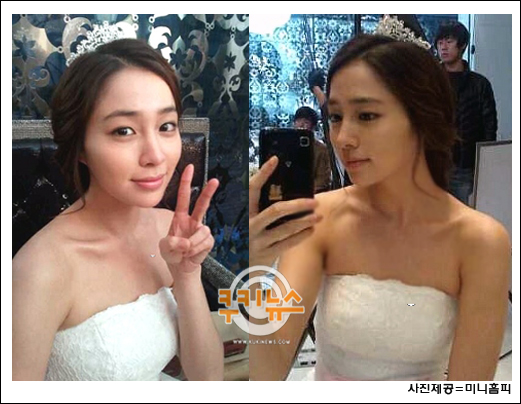 이민정은 지난 20일 자신의 미니홈피에 ‘웨딩드레스’라는 제목으로 두 장의 사진을 올렸다. 사진 속에서 이민정은 서울 청담동의 한 웨딩샵에서 어깨와 쇄골을 돋보이게 만드는 탑 드레스를 입고 청순한 매력을 드러냈다.