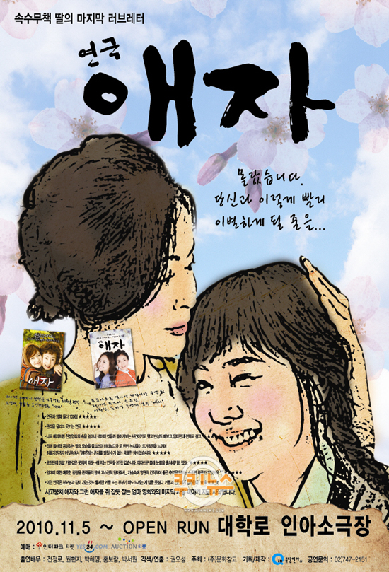 연극 ‘애자’는 지난 2009년 9월 국내 개봉한 한국영화 <애자>를 무대로 옮겨온 작품이다. 지난해 5월29일부터 9월19일까지 서울 충무아트홀 블랙 소공연장에서 배우 금보라와 소유진의 주연으로 초연을 성공리에 마쳤다. 이후 지난해 11월15일부터 지난 2월6일까지 서울 대학로 인아 소극장에서 1차 앙코르 공연을 마쳤고, 지난 3월6일까지 2차 앙코르 공연을 마무리했다. 두 차례의 앙코르 공연 이후에도 관객의 요청이 끊이지 않아 지난 14일부터 서울 대학로 인아 소극장에서 세 번째 앙코르 공연을 진행 중이다.