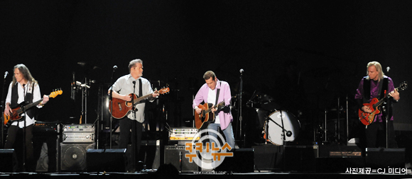 이글스가 한국 팬을 위해 선택한 첫 곡은 ‘세븐 브릿지 로드’(Seven Bridges Road)였다. 화려한 악기의 자극적 양념도 없이 네 명의 담백한 목소리가 체조경기장 안을 진하게 울렸다. 60대 노장임에도 불구하고 녹슬지 않은 청아한 음색은 관객을 놀라게 만들었고, 이내 귀를 잡아끌었다. 1만명은 이글스가 빚어내는 명품 공연에 서서히 젖어들었다.