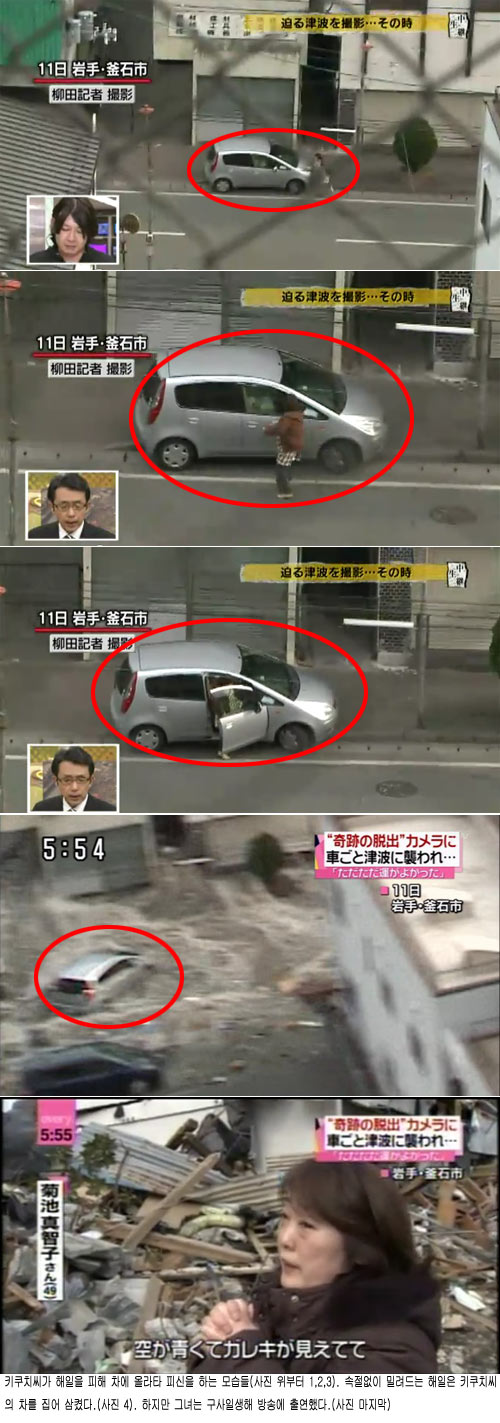 이와테현 가마이시에 거주하는 키쿠치씨는 해일을 미처 피하지 못하고 차에 탄 채로 휩쓸려갔다. 고지대에서 촬영한 카메라에 그녀의 마지막 피신 장면이 잡혔었다. “도망쳐. 도망쳐”하고 소리에 키쿠치씨는 자동차에 올라탔다.