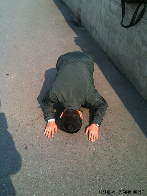김제동은 지난 20일 ‘나는 가수다’에서 김건모의 재도전을 제안해 논란을 불러일으켰다. 본의 아니게 사건의 중심에 서게 된 ‘입담꾼’ 김제동은 입을 열지 않고 다무는 쪽을 택했다. 대신 지난 29일 자신의 트위터에 길거리에서 큰 절을 올리는 사진을 올렸다.