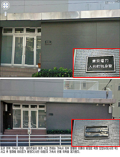 31일 다수의 일본 블로그에 따르면 도쿄 츄오구에 위치한 도쿄전력 기숙사 외벽에 원래 붙어 있었던 명패가 현재 검은 테이프로 가려져있다.