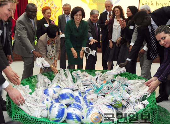 박춘희 송파구청장과 박종삼 월드비전 회장 등 주한 외교사절단이 28일 오후 서울 송파구 신천동 송파구청 대강당에서 열린 `주한 외교사절과 함께하는 지구촌 희망나누기' 행사에서 아프리카 어린이들에게 보낼 운동화를 대형 그물망에 넣고 있다. 강민석 선임기자 minseok@kmib.co.kr