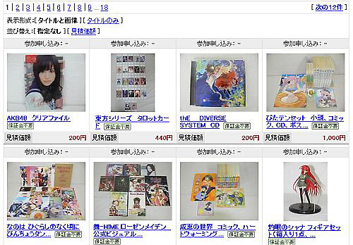 경매품은 아이돌 가수의 음반부터 애니메이션 주인공 피규어, 만화책 세트, 열쇠고리 등으로 잡다했다. 오타쿠(광적으로 집착하는 마니아)의 소집품을 방불케 했다. 가격은 200엔(약 2700원)부터 3600엔(4만8400원)으로 다양했다. 걸그룹 AKB48의 멤버가 그려진 파일은 200엔으로 가장 쌌고 애니메이션 피규어(1800엔)와 20권 가량의 만화책 세트(2000~3000엔대)는 상대적으로 고가(?)였다.