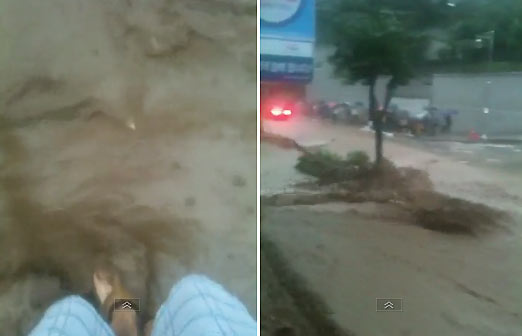 그가 올린 25초 가량의 동영상은 검은 흙탕물이 가득한 거리의 모습을 담고 있다. 언덕 위에서 내려오는 물이 마치 계곡을 이루며 아래쪽으로 흘러내렸다. 보행 도로 위에 행인들이 서 있지만 오도 가도 못하는 상황이 연출됐다.