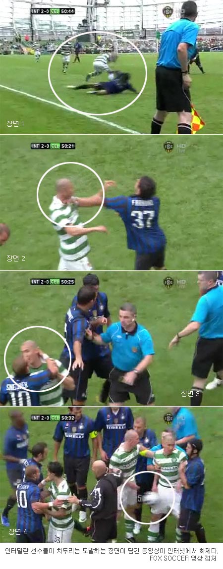 관련 동영상을 돌려 본 축구팬들은 인터밀란 선수들의 잇단 도발을 비난하고 있다. 이들은 “이탈리아 축구가 거칠기로 유명하지만 이처럼 비신사적이고 유치할 줄은 몰랐다”고 입을 모으고 있다.