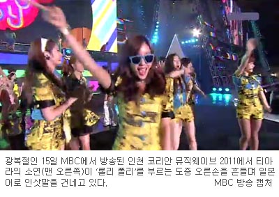 [쿠키 톡톡] MBC가 지난 15일 오후 5시에 방송한 ‘인천 코리안 뮤직웨이브 2011’(이하 인천한류콘서트)에서 인기 걸그룹의 한 멤버가 노래 도중 일본어로 인사를 건네 물의를 빚고 있다. 최근 일본의 독도 영유권 억지 주장 등으로 한일관계가 급속도로 악화된 상황인데다 광복절 지상파 TV에서 불거진 일이어서 우리 네티즌들은 불쾌감을 감추지 못하고 있다.