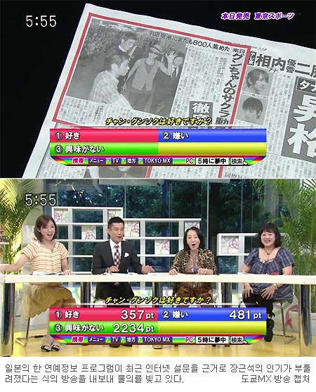 일본의 케이블TV인 ‘도쿄 메트로폴리탄 텔레비전’(도쿄 MX)은 지난 18일 인기 연예생활 정보 프로그램인 ‘5시에 집중’(5時に夢中)에서 장근석 인기에 대한 설문조사 결과를 발표했다.