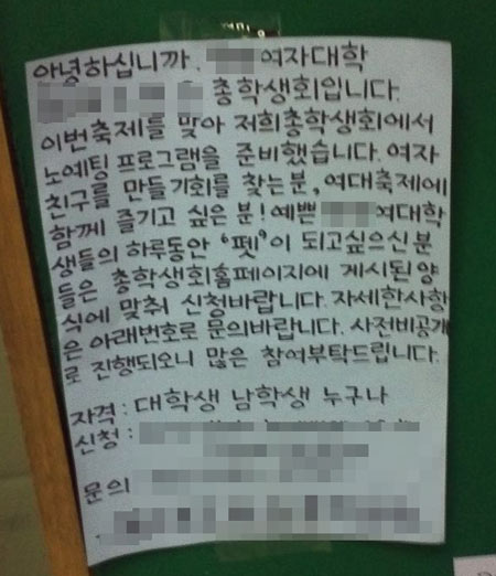 A대학의 노예팅 이벤트는 최근 온라인 게시판에 올라온 사진 때문에 알려졌다. 한 네티즌은 곧 있을 A대학 축제에서 황당한 이벤트가 열릴 예정이라며 A대학 인근 대학에서 촬영한 공지문을 올렸다. 공지문에는 “여자 친구를 만들 기회를 찾는 분, 여대 축제를 함께 즐기고 싶은 분, 예쁜 A여대학생들의 하루동안 펫(애완동물)이 되고 싶은 분은 총학생회 홈페이지에 게시된 양식에 맞춰 신청해 주시기 바랍니다”고 적혀있었다.