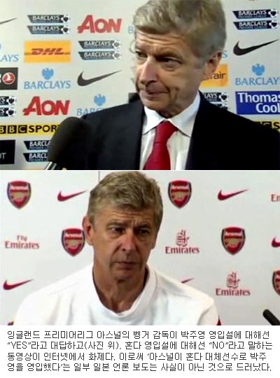 반면 벵거 감독은 지난 29일 맨체스터 유나이트드와의 정규리그 홈 경기 직후 가진 인터뷰에서 “오늘밤 공격수 한 명과 계약할 예정”이라고 말한 뒤 “한국인 공격수 박주영을 말하는 것이냐”는 기자의 질문에 “그렇다(YES)”고 대답해 눈길을 끌었다. 박주영에 대해 “YES”라고 말하고, 혼다에 대해 “NO”라고 말한 것이다.