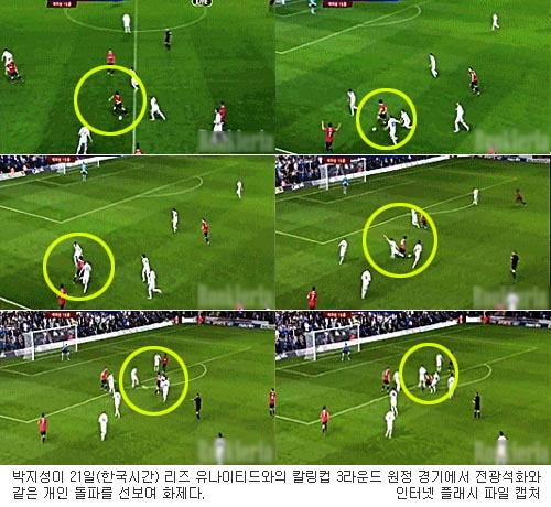 [쿠키 스포츠] ‘산소탱크’ 박지성(30·맨체스터 유나이티드)이 21일(한국시간) 리즈 유나이티드와의 칼링컵 3라운드 원정 경기에서 전광석화와 같은 개인 돌파를 선보여 화제다. 우리 축구팬들은 물론 맨체스터 유나이티드 팬들까지 박지성에게 “메시 같았다”며 찬사를 보내고 있다.