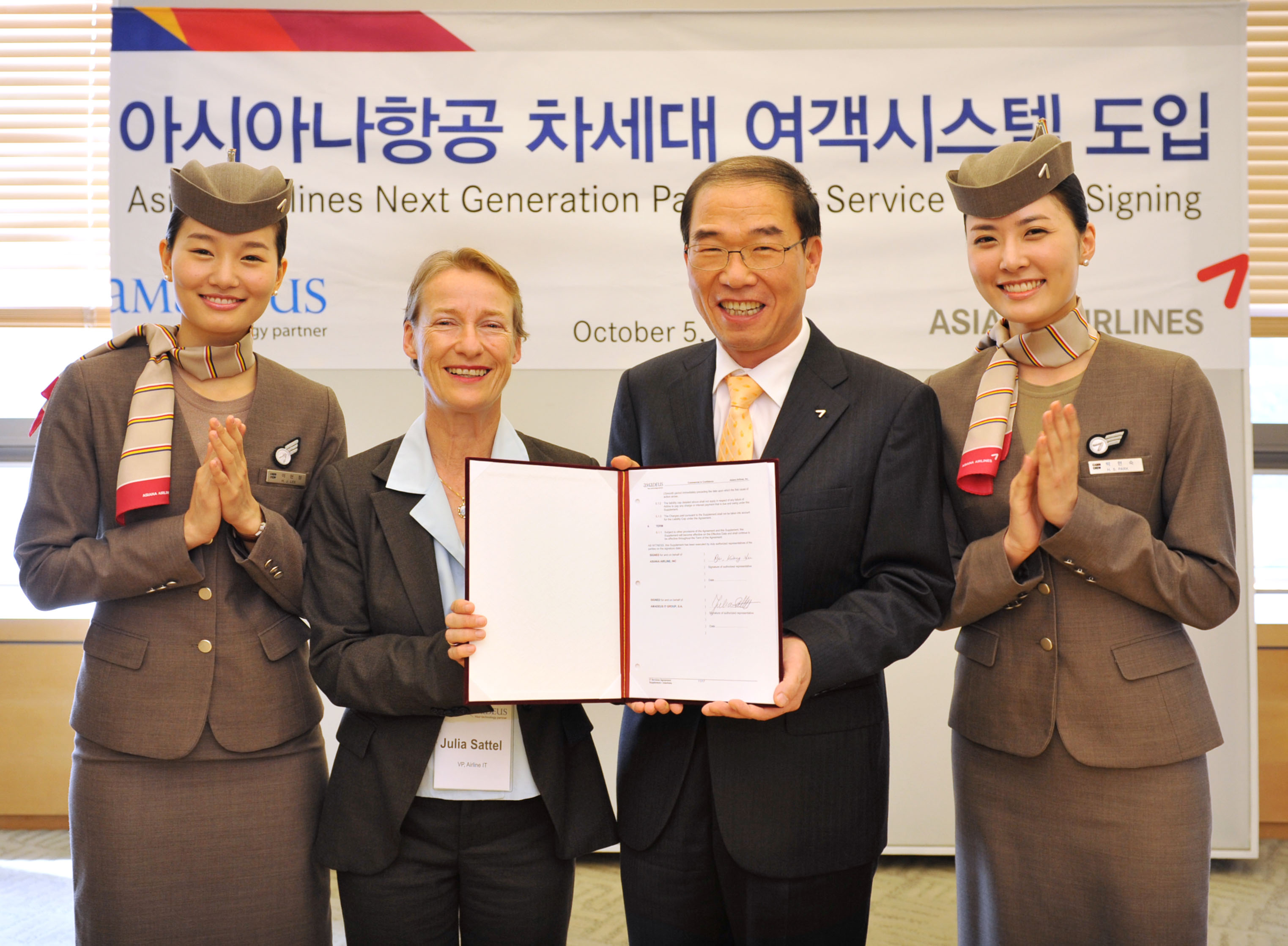 아시아나항공은 5일 서울 오쇠동 본사에서 류광희 여객본부장과 율리아 사텔 아마데우스 부사장 등이 참석한 가운데 ‘아시아나항공 차세대 여객시스템 도입 서명식’을 가졌다(사진).