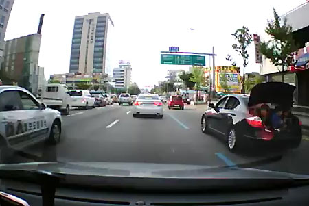 이 운전자는 앞서 달리는 승용차가 트렁크 문을 활짝 연 채 달리는 것으로 보고 이상하다는 반응을 보였다. 그리고 그 차량을 뒤쫓아 갔다. 이윽고 아이 세 명이 트렁크에 나란히 앉아있는 장면이 촬영됐다. 아이를 트렁크에 태운 승용차는 꽤 빠른 속도로 거리를 달렸고 차선 변경도 서슴지 않았다.