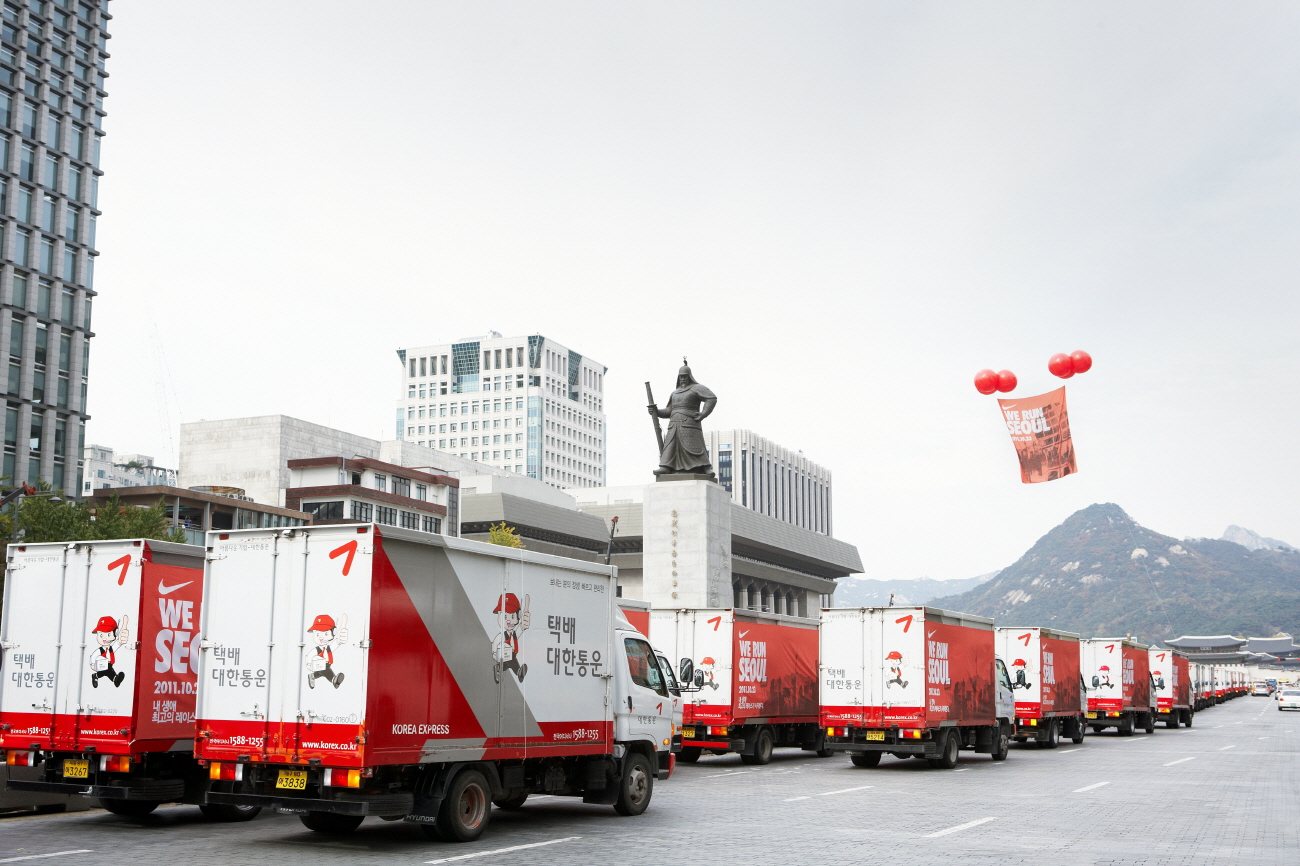 특히 이번 마라톤 대회 코스는 서울 광화문 광장에서 여의도 공원까지 10km 구간으로, 대한통운 택배차량 100여대는 출발지인 광화문 광장에 집결했다가 참가자들의 물품을 싣고 골인지점으로 줄지어 이동하는 진풍경을 벌였다.
