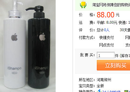 27일 중국 최대 온라인쇼핑몰 타오바오에서는 ‘아이샴푸(iShampo)’라는 이름의 샴푸가 버젓이 판매되고 있다. 해당 제품은 누가 봐도 애플사를 표절했음을 알 수 있다. 흰색과 검은색 두 가지로 구성된 제품에는 은색 사과 로고가 찍혀있다. 제품 뒷면에도 은색 글씨로 여러 가지 정보가 적혀있었다.