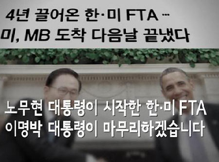 27일 저녁 전파를 탄 한·미FTA 비준 광고는 ‘노무현 대통령이 시작한 한·미FTA를 이명박 대통령이 마무리하겠다’는 내용을 골자로 하고 있다. 광고에는 노 전 대통령의 사진과 음성이 등장한다. 당시 언론 보도에 나온 발언도 다수 인용됐다.