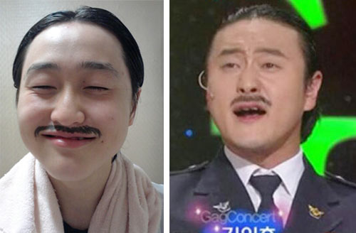 그러면서 여러 장의 인증 사진을 올렸다. 개콘의 인기 코너인 비상대책위원회에서 김원효가 머리 가르마를 5대 5 비율로 타고 수염을 기른 모습을 흉내 낸 것. 머리카락을 얼굴에 착 달라 붙였고 검은색 사인펜으로 수염을 그려 넣었다. 이렇게 촬영한 여러 장의 사진 속 네티즌의 모습은 김원효가 아닐까하는 착각이 들 정도로 닮아있었다. 눈매와 얼굴형, 웃고 찡그리는 표정은 김원효와 똑같았다.