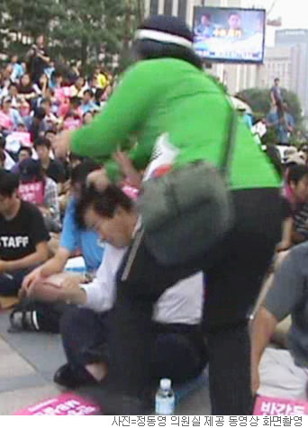 서울시와 경찰의 확인 한 결과 박 시장에게 폭행을 가한 박씨는 지난 8월15일 정 최고위원을 폭행했던 여성이었다. 정 최고위원은 당시 서울 청계광장에서 열린 ‘8·15 반값등록금 실현 국민행동, 등록금 해방의 날’에 참석했다가 봉변을 당했다(사진). 국민일보 쿠키뉴스 신은정 기자 sej@kmib.co.kr
