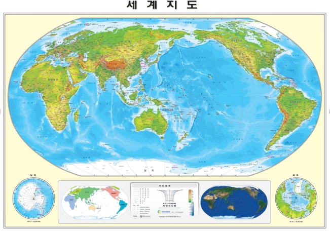 이 세계지도는 로빈슨 도법으로 제작한 것으로, 제작 과정에서 발생하는 형태와 면적의 왜곡을 적절히 조정해 전체적인 안정감과 균형감이 돋보이는 게 특징이다.