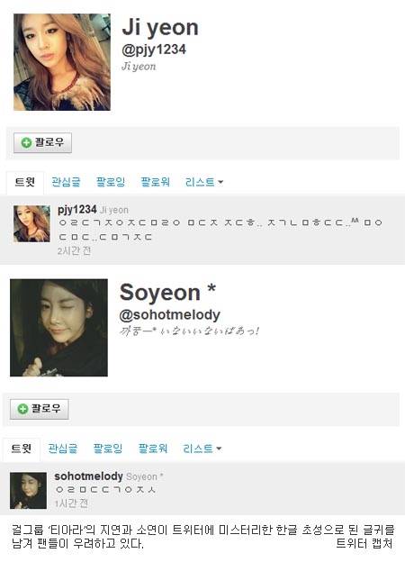 [쿠키 연예] 한국과 일본을 오가며 왕성한 활동을 벌이고 있는 한류 걸그룹 ‘티아라’의 일부 멤버들이 트위터에 한글 초성으로 된 의미심장한 글귀를 남겨 눈길을 끌고 있다. 초성을 나름대로 해석한 티아라 팬들은 “바쁜 스케줄로 멤버들이 몸도 마음도 힘들어하는 것 같다”며 발을 동동 구르고 있다.