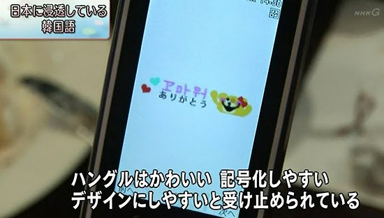 25일 일본 각종 커뮤니티 사이트에 따르면 NHK는 최근 한 프로그램에서 휴대전화로 메시지를 보낼 때 한국어를 사용하는 것이 일반적인 현상으로 자리 잡고 있다고 전했다. 방송이 소개한 한글을 사용하는 방식은 다양했다. ‘고마워’와 같은 한글을 그대로 따라 써 그림처럼 보내거나 ‘미안해요’ 등과 같은 말을 소리 나는 대로 일본어로 표기한다는 것이다. 방송은 “한글이 귀엽고 기호화하기 쉽다”며 한글이 디자인의 하나로 받아들여지고 있다고 전했다.
