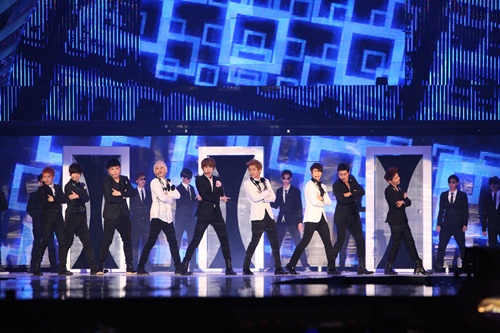 [쿠키 연예] 29일 저녁 싱가포르 인도어 스타디움에서 열린 2011 Mnet 아시안 뮤직어워드(MAMA)에서 올해의 앨범상(Mr.Simple)을 받은 슈퍼주니어가 공연을 펼치고 있다.