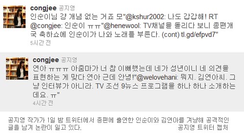 공씨는 1일 밤 소셜네트워크 서비스인 ‘트위터’에서 한 트위터러가 “TV채널 돌리다 보니 종편개국 축하쇼에 인순이가 나와 노래를 부른다”고 한 것에 대해 “인순이님 걍(그냥) 개념 없는 거죠 모(뭐)”라고 되받았다.