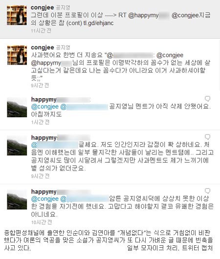 [쿠키 사회] 보수언론의 종합편성채널(종편)에 출연한 인순이와 김연아를 “개념 없다”는 식으로 비판했다가 여론의 역공을 맞은 소설가 공지영씨가 또 다시 빈축을 사고 있다. 이번에는 일반인을 도마에 올린 게 화근이었다.