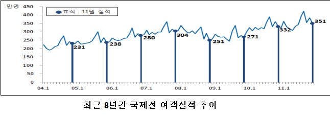 국토해양부는 글로벌 경기불안 등에도 불구하고 11월 국제선 여객이 외국인 관광수요 증가 등으로 지난해 11월(332만명)보다 5.8% 증가한 351만명을 기록, 역대 11월 중 최대 실적을 올렸다고 20일 밝혔다. 국내선 여객도 제주여행 수요 증가 등으로 지난해 11월(168만명)보다 7.1% 증가한 180만명을 운송한 것으로 집계됐다.
