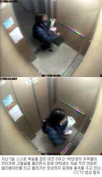 [쿠키 사회] 지난 2일 스스로 목숨을 끊은 대전 D여고 1학년생의 유족들이 인터넷에 억울한 사연과 함께 일부 학생들과 학교 담임교사 등을 고발하는 글을 올려 파문이 일고 있다. 유족들은 특히 피해 여학생이 자살 직전 아파트 엘리베이터를 타고 올라가는 CCTV 영상까지 공개해 충격을 더하고 있다.