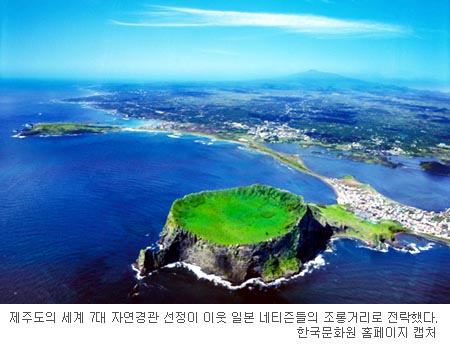 제주도의 세계 7대 자연경관 선정이 이웃 일본 네티즌들의 조롱거리로 전락했다. 일본 네티즌들은 제주도 공무원들이 7대 자연경관 투표 과정에서 1억통 이상의 전화를 걸고 수백억원의 전화료를 썼다는 의혹 등에 대해 “평소 바보 같다고 생각했던 한국이지만 공무원까지 이런 수준이라니 황당하다 못해 미스터리하기까지 하다”고 비판하고 있다.
