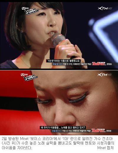 2일 밤 방송된 케이블 채널 Mnet ‘보이스 코리아’에서 ‘1대’ 란으로 알려진 가수 전초아가 수준 높은 노래 실력을 뽐내고도 탈락해 멘토와 시청자들의 아쉬움을 자아냈다.