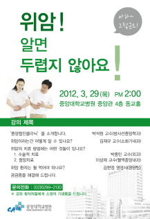 [쿠키 건강] 중앙대병원(원장 김성덕) 종양협진클리닉은 오는 29일 오후 2시부터 병원 중앙관 4층 동교홀에서 ‘위암! 알면 두렵지 않아요!’란 주제의 건강강좌를 개최한다.