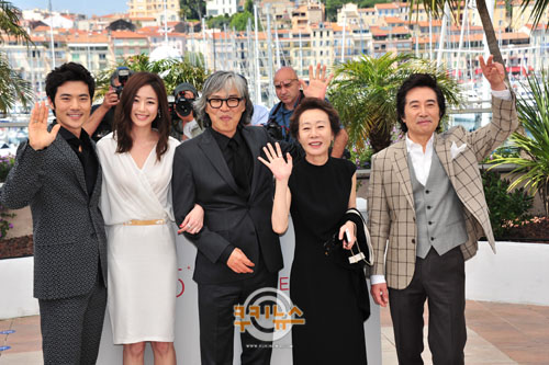 [쿠키 연예] 김강우, 김효진, 임상수 감독, 윤여정, 백윤식(왼쪽부터)이 26일(프랑스 현지시간) 제65회 칸국제영화제에서 ‘돈의 맛’(감독 임상수, 제작 휠므빠말) 국제 기자회견을 마친 뒤 포토콜에 응하고 있다.