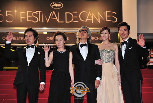 [쿠키 연예] 김강우, 김효진, 임상수 감독, 윤여정, 백윤식(왼쪽부터)이 26일 오후 10시(프랑스 현지시간) 프랑스 칸 뤼미에르극장에서 열린 ‘돈의 맛’(제작 휠므빠말, 제공 롯데엔터테인먼트·시너지) 공식상영 전 레드카펫에 올라 포즈를 취했다.