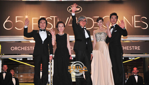 [쿠키 연예] 김강우, 김효진, 임상수 감독, 윤여정, 백윤식(왼쪽부터)이 26일 오후 10시(프랑스 현지시간) 프랑스 칸 뤼미에르극장에서 열린 ‘돈의 맛’(제작 휠므빠말, 제공 롯데엔터테인먼트·시너지) 공식상영 전 레드카펫에 올라 포즈를 취했다.