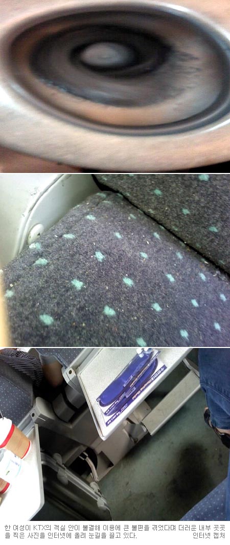 한 여성이 KTX의 객실 안이 불결해 이용에 큰 불편을 겪었다며 더러운 내부 곳곳을 찍은 사진을 인터넷에 올려 눈길을 끌고 있다. 네티즌들은 “비싼 요금을 내고 더러운 열차를 이용하느니 차라리 자가용을 끌고 다니는 게 낫겠다”며 혀를 차고 있다.
