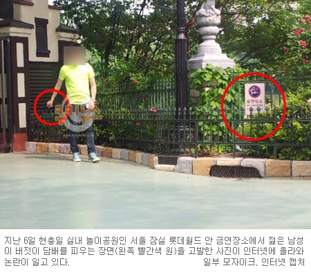 자신을 대전에 사는 22세 여자라고 밝힌 네티즌 A씨는 7일 오후 한 포털사이트 게시판에 ‘6월 6일 롯데월드 무개념들’이라는 제목의 글을 통해 롯데월드 안 금연구역에서 흡연하던 남성들을 고발했다.